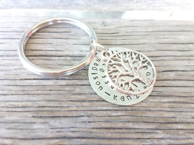 ~ 1" Stainless Steel Pendant attached to a key ring ~ Stamped with a saying/names of your choice ~ Swavorski Stones of your choice are attached to a Sterling Silver Tree charm. Up to 7 Stones fit on the tree. Tree Charm is included