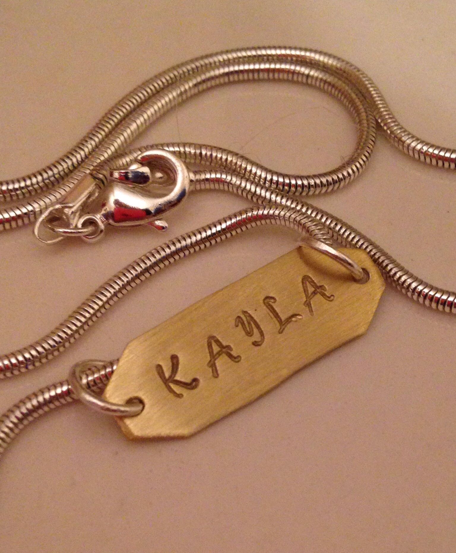 Elegant handcrafted name plate pendant, set on a sterling silver snake chain and personalized with a birthstone and your choice of any letter, monogrammed initials, names, words, Roman numerals, or other combination of text and characters...all customized just for you!