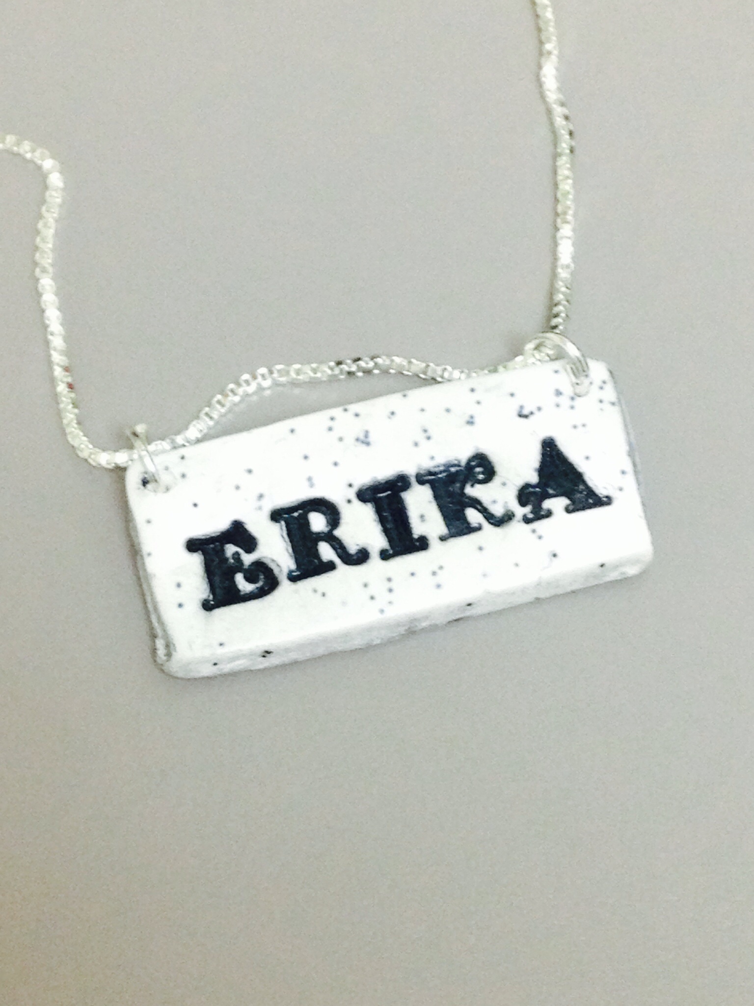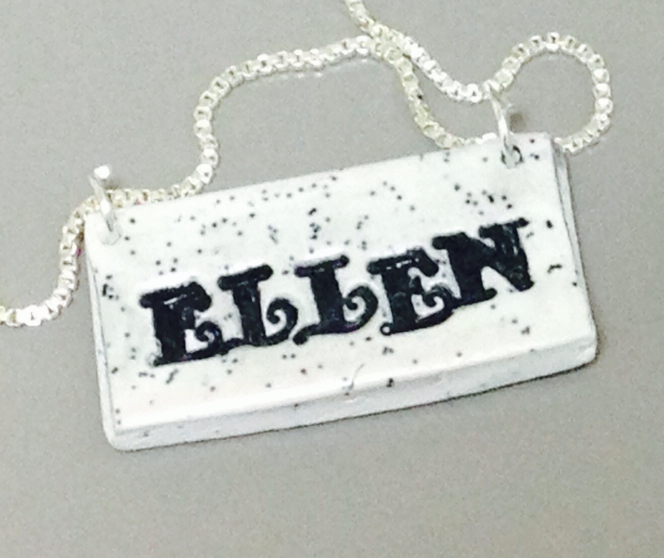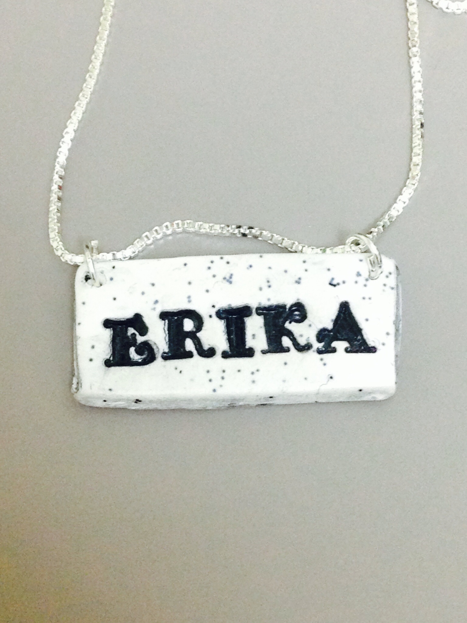 One Of A Kind Name Necklace. Each name is handstamped into jewelry clay, cooked, and then painted. Choose any name or saying you would like. Truly one of a kind. You will not find a piece this unique any where else.